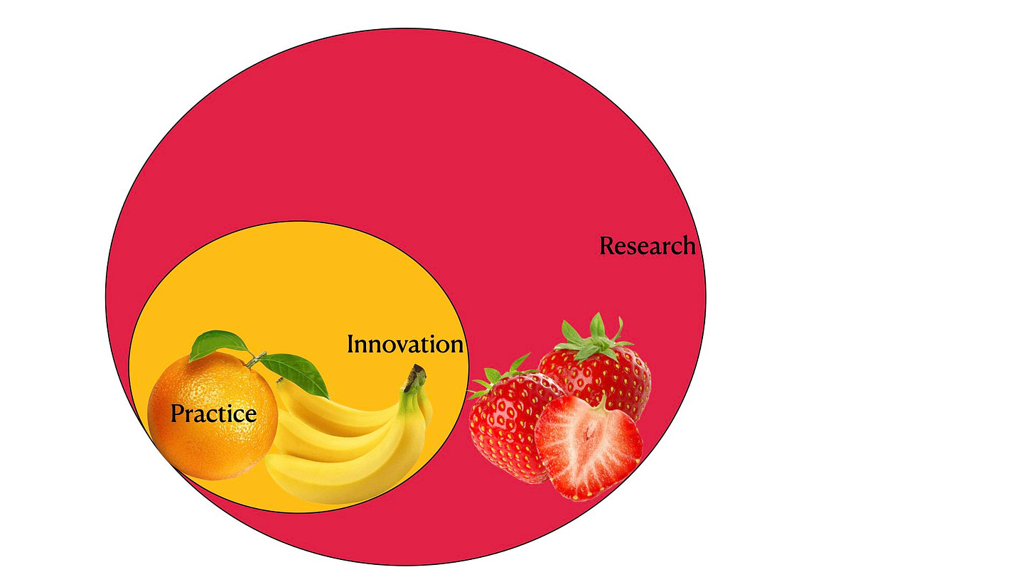 In practice, it is not always easy to distinguish those three areas; practice, innovation, and research. For example, is the inclusion of a new bipolar forceps innovation or is it regular practise? Is the incorporation of ultrasonography into the surgery for brain tumours innovation or research?