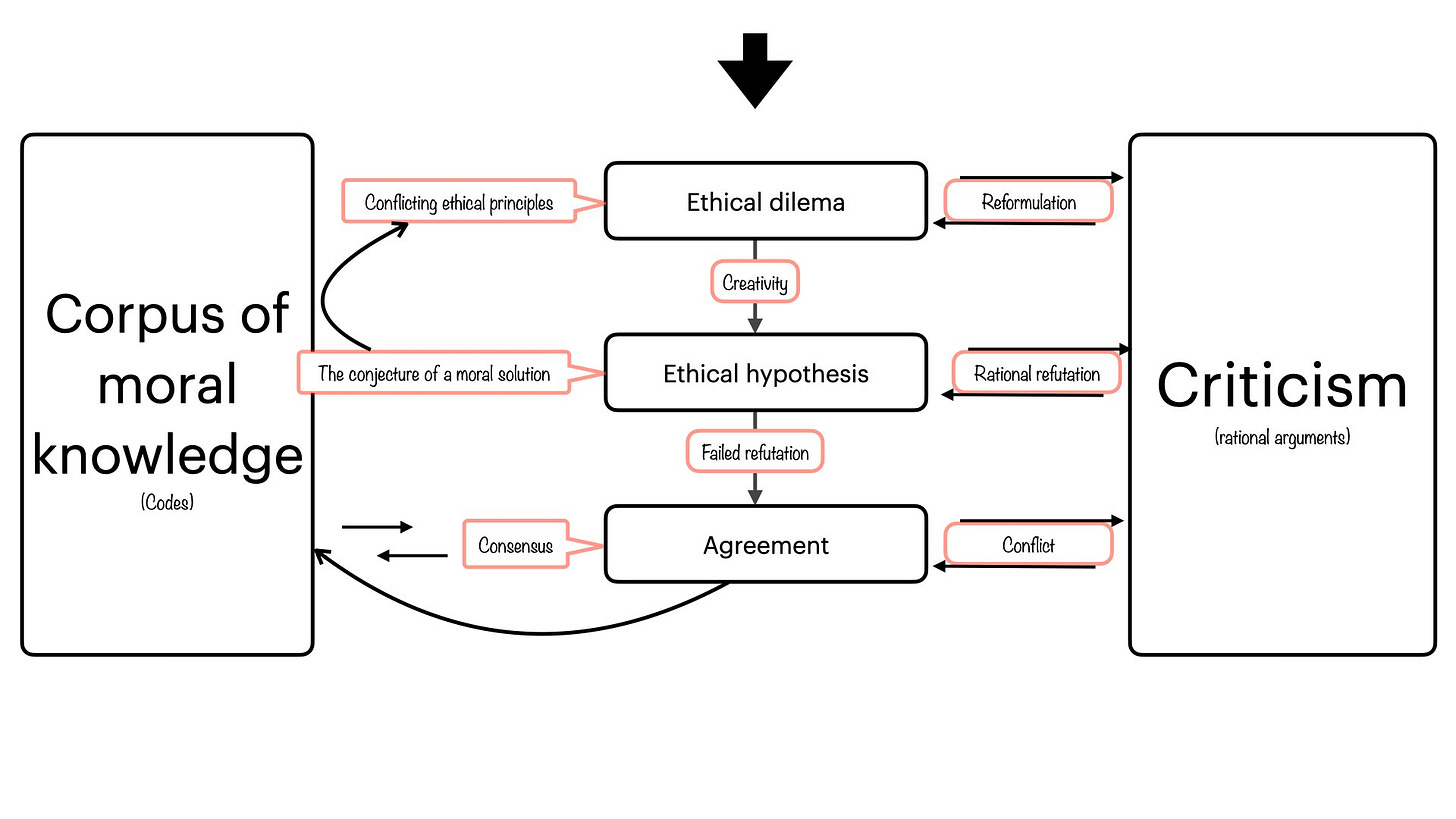 Second, it is not always obvious what is good and wrong. To better understand morality we should constantly criticise our proposed solution to ethical dilemas. The corpus of ethical knowledge informs that rational criticism and is actualise by it. In this scenario ethical knowledge is not static, it is ever growing and susceptible to error and improvement.