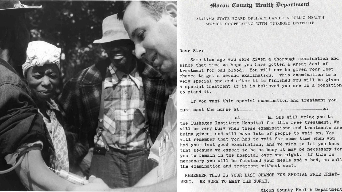 Before started, the participating researchers reflected about the morality of such an experiment in the following terms: Given the living conditions of the studied population, notably the lack of access to modern medicine, they are not likely to receive treatment anyway; the suffering of these men can be used for something good instead to go wasted; to get to know better the natural history of syphilis. That will make for the progress of the medical science and will potentially reduce human suffering in the future.